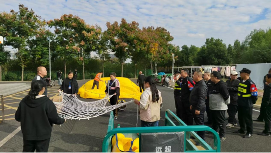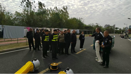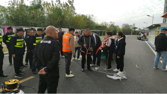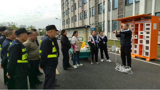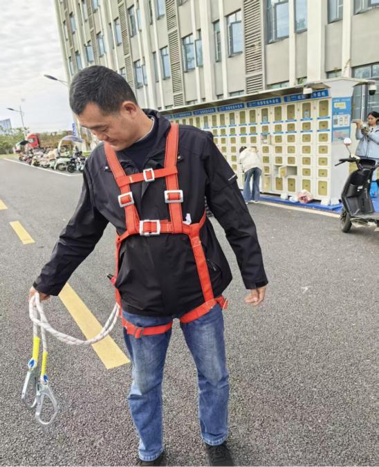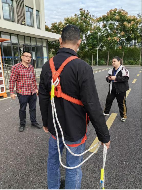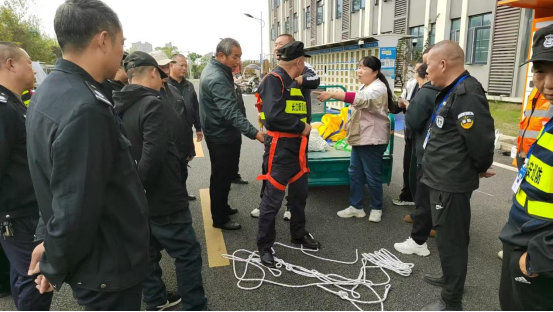 理论授课结束后,参训人员移步至室外演练场地,在指导老师的协助下,分组使用校内现有灭火器材进行了初期火灾扑救的实际操作演练。通过亲手操作,教职工们不仅增强了灭火器材使用的熟练度和动手能力,也进一步提高了在火灾中的协同配合和应急响应意识。培训接近尾声时,专门组织全体保卫处人员完成了火灾应急处置知识的书面考核,并由李博文老师进行现场逐一点评和全面总结。最后,针对学校保卫队伍的特殊职责,还增设了高空防坠落救援装备使用培训环节,通过专业人员的实地演示,详细介绍了安全绳、缓降器等设备的正确穿戴与操作方法,进一步扩展了保卫人员在应对高空突发事件中的技能储备和实战能力。